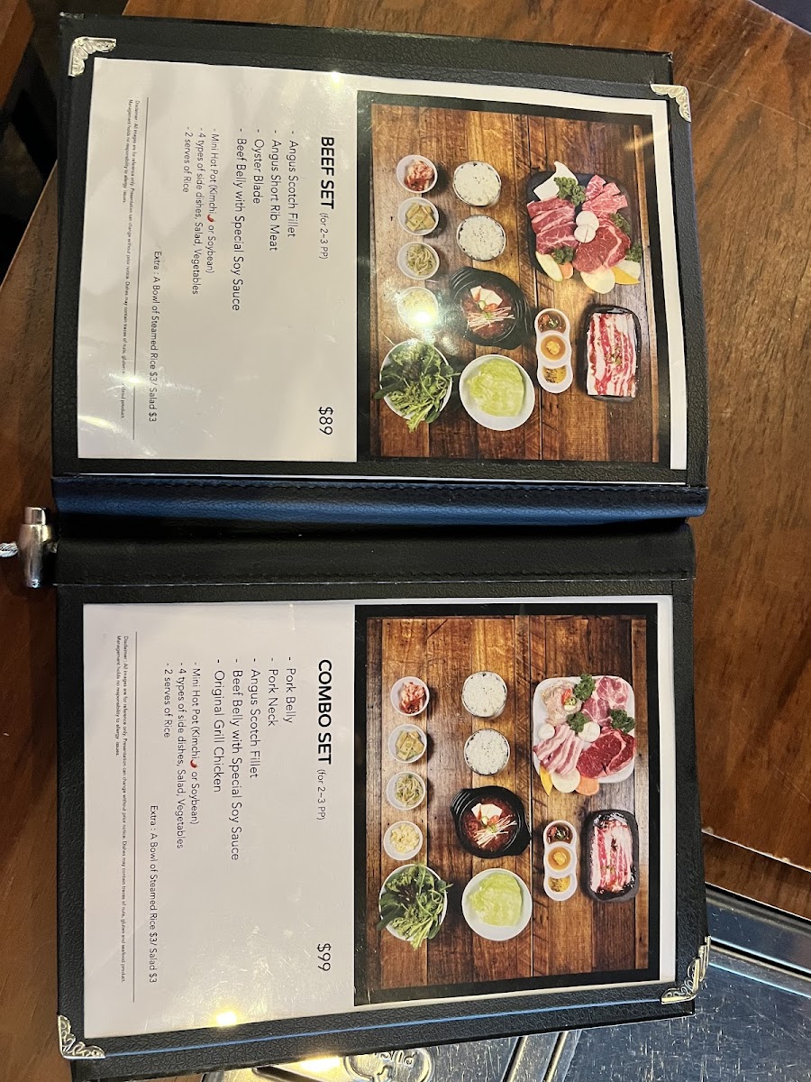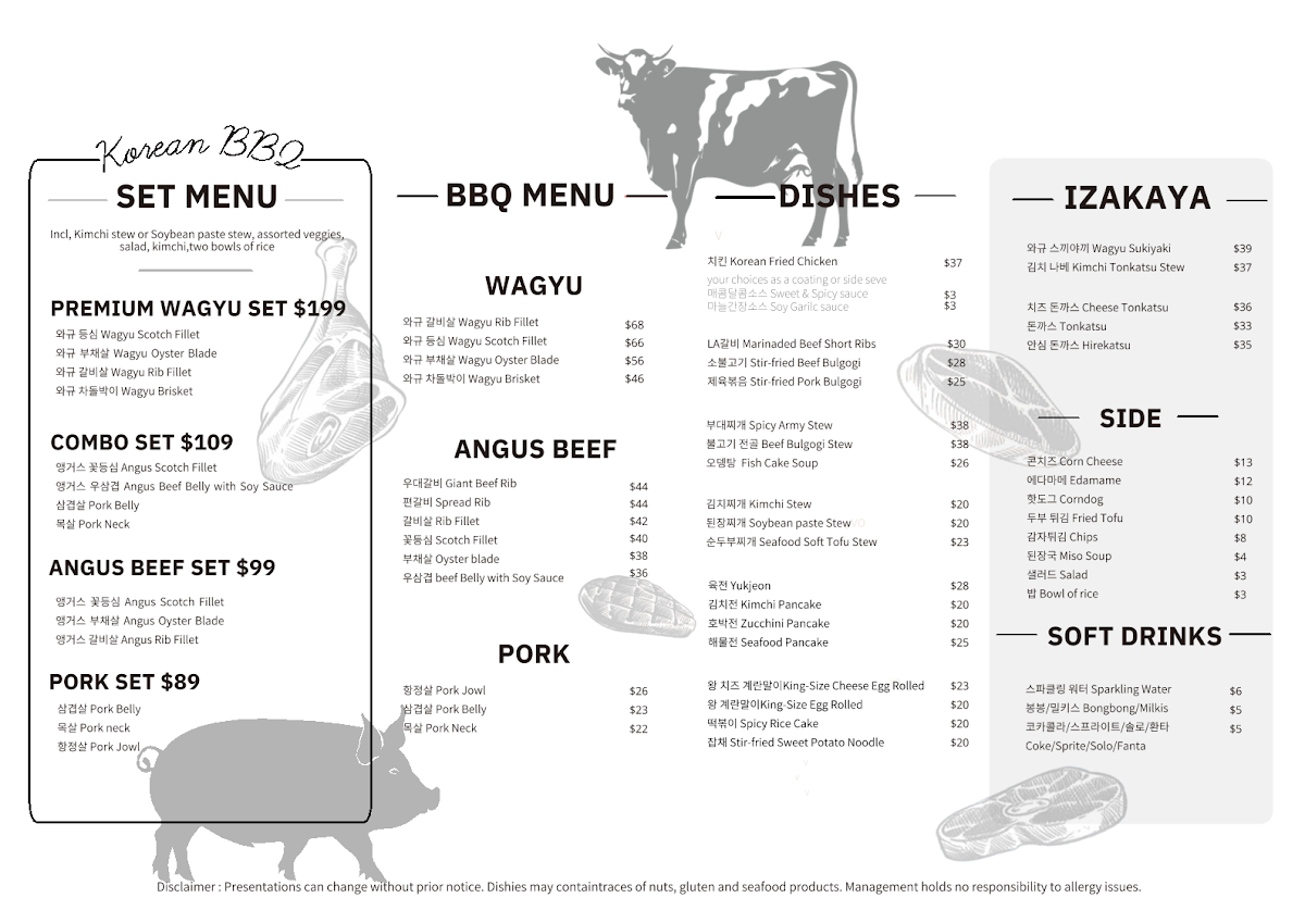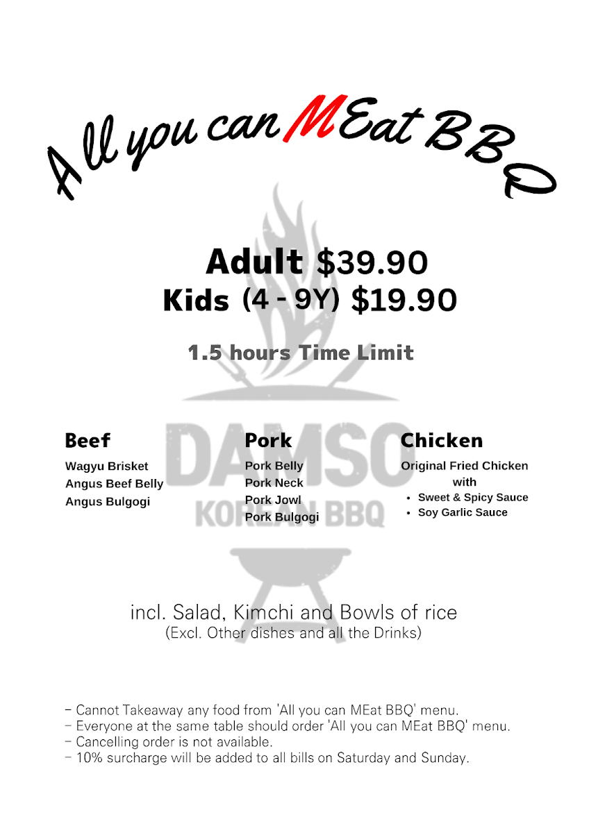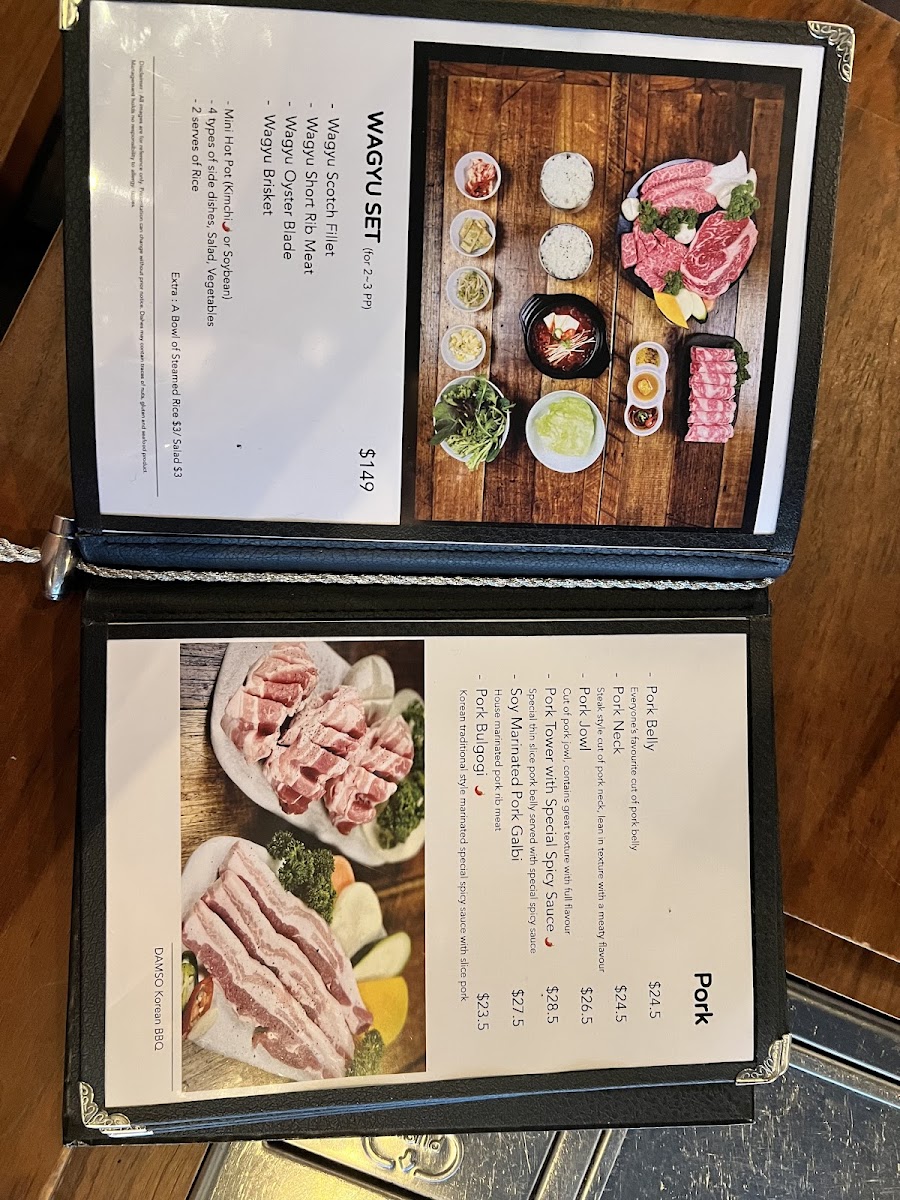 Dining at Damso Korean BBQ on Glen Huntly Road is a treat for those who appreciate both variety and quality. The set menus, including the Premium Wagyu Set, Combo Set, Angus Beef Set, and Pork Set, offer a curated experience for different tastes, highlighting the restaurant’s focus on premium meats. Wagyu lovers can indulge in options like Wagyu Rib Fillet, Wagyu Scotch Fillet, Wagyu Oyster Blade, and Wagyu Brisket, while the Angus Beef selections feature hearty cuts such as Giant Beef Rib, Spread Rib, Pork Neck, Rib Fillet, and Scotch Fillet. For pork enthusiasts, choices like Pork Jowl, Pork Belly, and Pork Neck showcase rich flavors and tender textures. The à la carte dishes also impress, from the crispy Korean Fried Chicken to the comforting Kimchi Tonkatsu Stew, the cheesy indulgence of Cheese Tonkatsu, and the savory Marinated Beef Short Ribs. The Izakaya offering of Wagyu Sukiyaki adds a refined, flavorful touch, while sides such as Corn Cheese, Edamame, Corndog, Fried Tofu, and Chips provide both variety and balance. To accompany the meal, the drink selection ranges from Sparkling Water to Korean favorites like Bongbong/Milkis, along with classic soft drinks including Coke, Sprite, Solo, and Fanta. Overall, the menu at Damso Korean BBQ combines premium meats, comforting dishes, and playful sides, creating a well-rounded experience that satisfies both the adventurous eater and the classic barbecue lover.